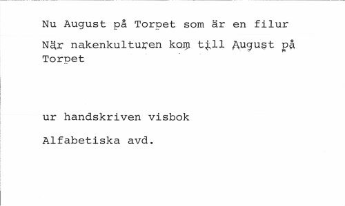 //// Nu August på Torpet som är en filur //// När nakenkulturen kojri t^ll på //// Torpet //// ur handskriven visbok Alfabetiska avd. ////