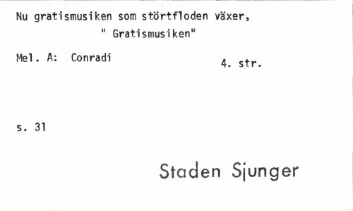 //// Nu gratismusiken som störtfloden växer, " Gratismusiken" //// Mel. A: Conradi 4 str //// s. 31 //// Staden Sjunger ////