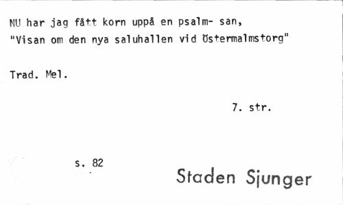 //// NU har jag fått korn uppå en psalm- san, "Visan om den nya saluhallen vid östermalmstorg" //// Trad. Mel. //// 7. str. //// s. 82 //// Sfcrden Sjunger ////
