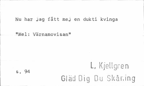 //// Nu har Jag fått mej en dukti kvinga "Mel: Värnamovisan" //// L, Kjellgren //// s . 94 //// Gläd Dig Dy Skåning ////