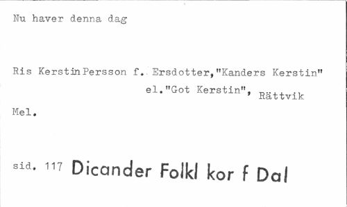 //// Nu haver denna dag //// Ris Kerstin Persson f. Ersdotter,"Kanders Kerstin" //// el. "Got Kerstin", //// ' Rattvik //// Mel. //// sid. 117 Dicancfer Folkl kor f Daf ////