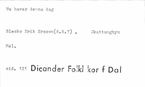 //// Nu haver denna dag //// Blecko Erik Ersson(d.ä.?) , Skattungbyn //// Mel. //// sid. 121 Dicancfer Folkl kor f Daf ////