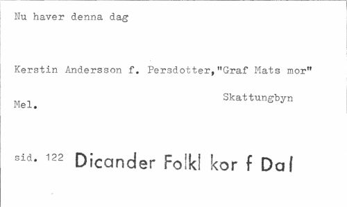 //// Nu haver denna dag //// Kerstin Andersson f. Persdotter,"Graf Mats mor" //// Skattungbyn //// Mel. //// Sid. 122 Dicander Folkl kor f Dal ////