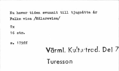 //// Nu haver tiden svunnit till tjugoåtta år Falks visa /Målarevisa/ //// Tx //// 16 str. s. 179££ //// Varml. Kultjrtrcd. De! 7 Turesson ////