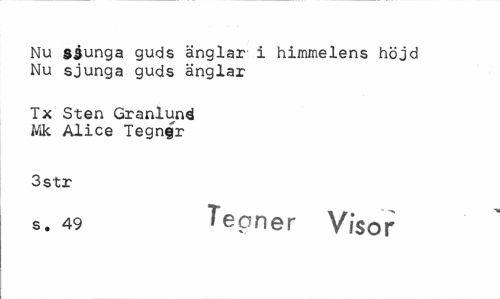 //// Nu sjunga guds änglar i himmelens höjd Nu sjunga guds änglar //// Tx Sten Granlund Mk Alice Tegn§r //// 3 str //// s. 49 Teorier Visor ////