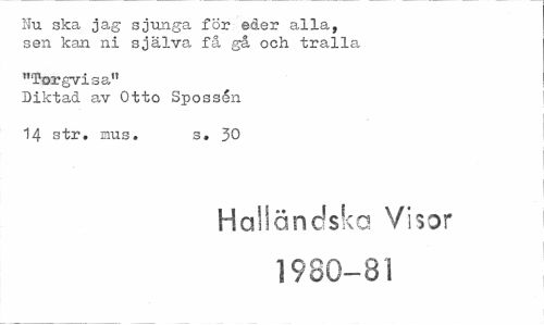 //// Nu ska jag sjunga för eder alla, sen kan ni själva få gå och tralla //// "Torgvisa11 //// Diktad av Otto Spossén 14 str. mus. s, 30 //// Hollondska Visor ////