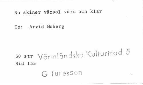 //// Nu skiner vårsol varm och klar Tx: Arvid Moberg //// 30 str värmländska Kulturtrad 5 //// Sid 135 //// G furesSon ////