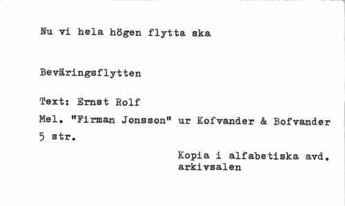 //// Nu vi hela högen flytta ska //// Beväringsflytten Text: Ernst Rolf //// Mel. "Firman Jonsson" ur Kofvander & Bofvander 5 str. //// Kopia i alfabetiska avd. arkivsalen ////