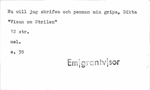 //// Nu will jag skrifwa och pennan min gripa, Dikta "Visan om Strilen" 12 str. mel. s. 38 //// Emiqrantvjsor ////
