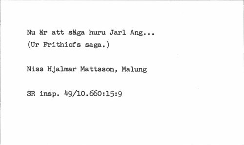 //// Nu är att säga huru Jarl Ang... (Ur Frithiofs saga.) //// Niss Hjalmar Mattsson, Malung //// SR insp. ^9/10.660:15!9 ////