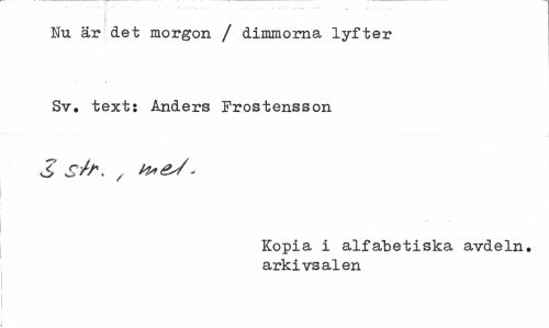 //// Nu är det morgon / dimmorna lyfter Sv. text: Anders Frostensson //// Z s/f. , < //// Kopia i alfabetiska avdeln. arkivsalen ////
