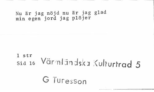 //// Nu är jag nöjd nu är jag glad min egen jord jag plöjer //// 1 str //// sid i6 Värn lind sk 3 Kuhurtrad 5 G Turesson ////