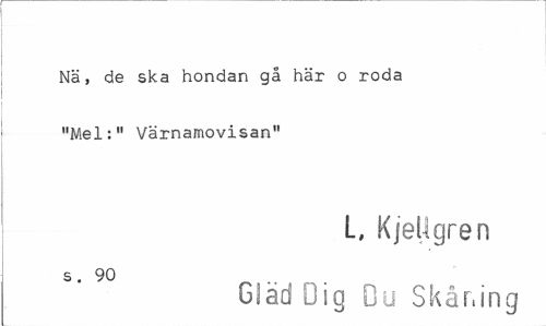 //// Nä, de ska hondan gå här o roda "Mel:" Värnamovisan" //// L, Kjellgren //// s. 90 //// Gläd Dig Du Skåning ////