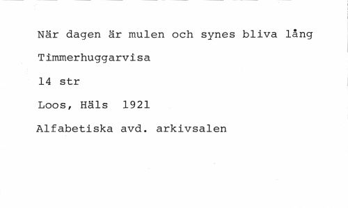 //// När dagen är mulen och synes bliva lång //// Timmerhuggarvisa //// 14 str //// Loos, Häls 1921 Alfabetiska avd. arkivsalen ////