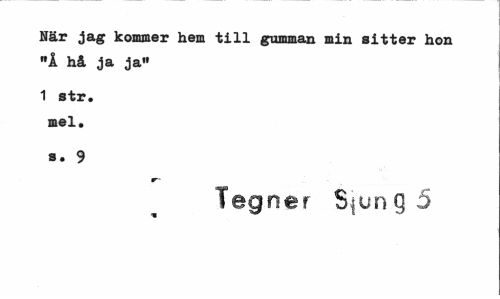 //// När jag kommer hem till gumman min sitter hon "Å hå ja ja" //// 1 str. mel. //// s. 9 //// ir> //// Teg ner Sjun g 5 //// "M ////