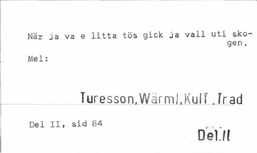 //// När ja va e litta tös gick ja vall uti skogen . //// Mel: //// _ Turesson.WärmLKulT frad //// Del II, sid 84 //// Del/f ////