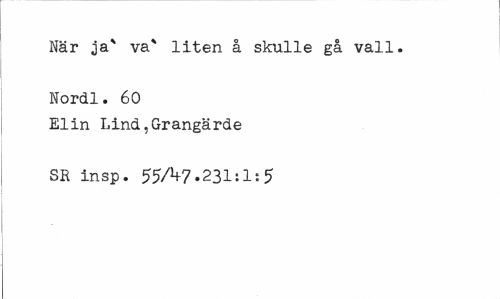 //// När ja* va* liten å skulle gå vall. Nordl. 60 //// Elin Lind,Grangärde SR insp. 55/1+7.231:1:5 ////