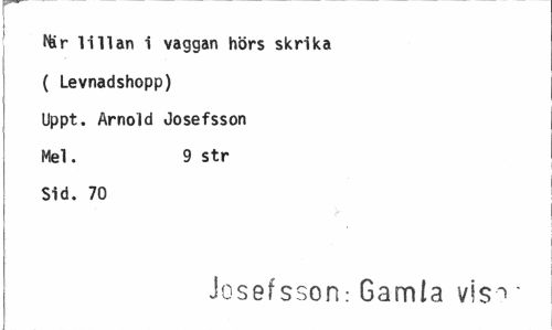 //// ffcr lillan i vaggan hörs skrika //// ( Levnadshopp) //// Uppt. Arnold Josefsson //// Mel. 9 str //// Sid. 70 //// Josefsson.- Gamla vis">" ////