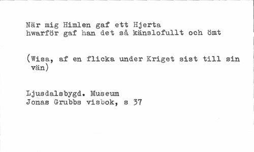 //// När mig Himlen gaf ett Hjerta //// hwarför gaf han det så känslofullt och ömt //// (Wisa, af en flicka under Kriget sist till sin vän) //// Ljusdalsbygd. Museum Jonas G-rubbs visbok, s 31 ////