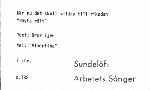 //// När nu det skall väljas till riksdan "Rösta rött" //// Text: Bror Ej ve Mel: "Albertina" //// 7 str- Sundelöf: //// s-1^ Arbetets Sånger ////