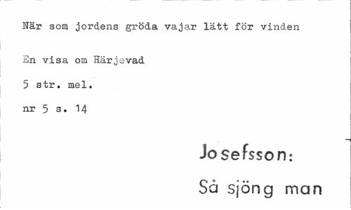 //// När som jordens gröda vajar lätt för vinden //// Sn visa om Härjevad 5 str. mel. nr 5 s• 14 //// Josefsson: //// Så sjöng man ////