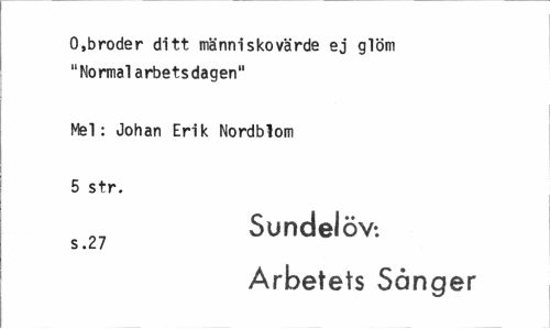 //// O,broder ditt människovärde ej glöm "Normalarbetsdagen" //// Mel: Johan Erik Nordblom //// 5 str. //// Sundelöv; //// s .27 //// Arbetets Sånger ////