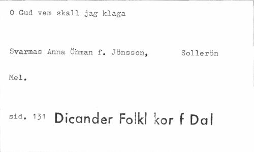 //// O Gud vem skall jag klaga //// Svarmas Anna Öhman f. Jönsson, Sollerön //// Mel. //// sid. 131 Dicander Folkl kor f Dal ////