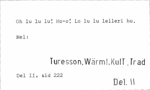//// Oh lu lu lu'. Ho-o'. Lo lu lu lelleri hu. Mel: //// Turesson,WärnUKulT .Träd //// Del II, sid 222 //// De). U ////