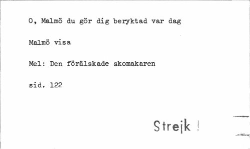 //// O, Malmö du gör dig beryktad var dag Malmö visa //// Mel: Den förälskade skomakaren sid. 122 //// Strejk I ~~ ////
