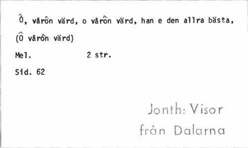 //// Ö, våron värd, o våron värd, han e den allra bästa, (0 våron värd) Mel. 2 str. //// Sid. 62 //// Jonth: Visor //// från Dalarna ////
