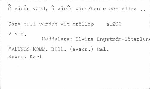 //// Ö våron värd, o våron värd/han e den allra .. //// Sång till värden vid bröllop s.203 2 str. //// Meddelare: Elvma Engström-Söderlun //// MALUNGS KOMM. BIBL. (avskr.) Dal. Sporr, Karl ////