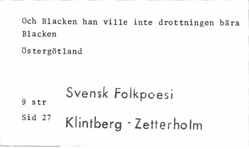 //// Och Blacken han ville inte drottningen bära Blacken //// Östergötland //// Svensk Folkpoesi //// 9 str //// sld27 Klintberg-Zetterholm ////