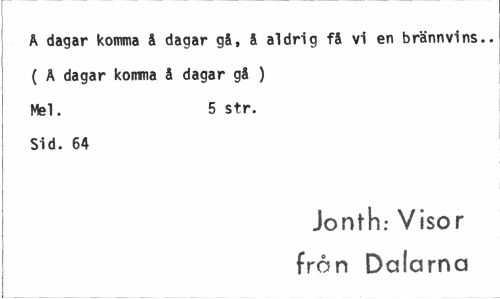 //// Ä dagar komma å dagar gå, å aldrig få vi en brännvins.. ( Ä dagar komma å dagar gå ) Mel. 5 str. //// Sid. 64 //// Jonth: Visor //// från Dalarna ////