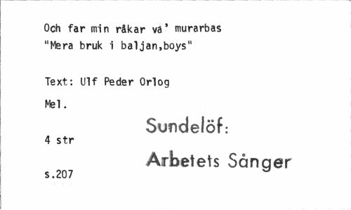 //// Och far min råkar vä' murarbas "Mera bruk i baljan.boys" //// Text: Ulf Peder Örlog Mel. //// Sundelöf: //// 4 str //// Arbetets Sånqer //// s .207 ////