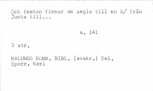 //// Och femton finnar de segla till en ö/ från Junta till. . . //// s. 141 //// 3 str. //// MALUNGS KOMM. BIBL. (avskr.) Dal. Sporr, Karl ////