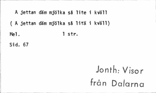 //// A oettan däm mjölka så lite i kväll ( Ä jettan däm mjölka så litä i kväll) Mel. 1 str. //// Sid. 67 //// Jonth: Visor //// frnn Dalarna ////