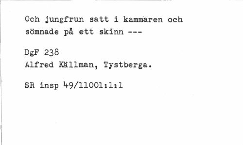 //// Och jungfrun satt i kammaren och somnade på ett skinn --- //// DgF 238 //// Alfred Källman, Tystberga. SR insp ^9/110011ls1 ////