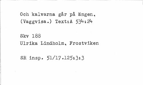 //// Och kalvarna går på ängen, (Vaggvisa.) Text:A 53kt2k //// Skv 188 //// Ulrika Lindholm, Frostviken SK insp. 51/17»125*3*3 ////