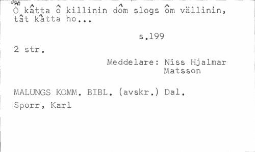 //// Ö katta o killinin dom slogs om vallinin, tat katta ho... //// s .199 //// 2 str. //// Meddelare: Niss Hjalmar Matsson //// MALUNGS KOMM. BIBL. (avskr.) Dal. Sporr, Karl ////