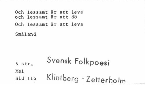 //// Och lessamt är att leva och lessamt är att dö //// Och lessamt är att leva Småland //// 5 str, Svensk Folkpoesi //// Mel //// sid 116 Klintberg - Zetterho?m ////
