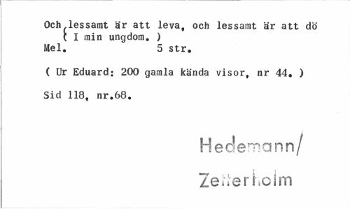 //// Och.lessamt är att leva, och lessamt är att dö //// { I min ungdom. ) Mel. 5 str. //// ( Ur Eduard: 200 gamla kända visor, nr 44. ) //// Sid 118, nr.68. //// H ederna nn/ Zeiierholm ////