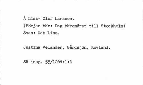 //// Å Liss- Olof Larsson. //// (Börjar här: Dag häromåret till Stockholm) Svas: Och Liss. //// Justina Veländer, Gårdsjön, Kovland. SR insp. 55/1264:1:4 ////