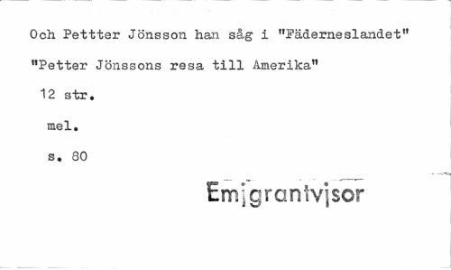 //// Och Pettter Jönsson han såg i "Fäderneslandet" "Petter Jönssons resa till Amerika" 12 str. mel. s. 80 //// Em^grantv]sor ////