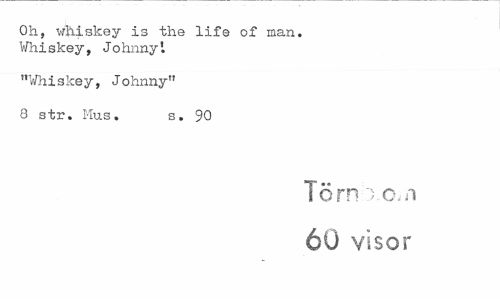 //// Oh, whiskey is the life of man. Whiskey, Johnny1. //// "Whiskey, Johnny" //// 8 str. Mus. s. 90 //// Törn ) o,n 60 visor ////