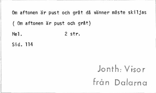 //// Om aftonen är pust och gråt då vänner måste skiljas ( Om aftonen är pust och gråt) Mel. 2 str. //// Sid. 114 //// Jonth: Visor //// från Dalarna ////