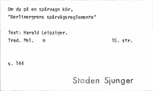 //// Om du på en spårvagn kör, "Berlinergrens spårvägs reglemente" //// Text: Harald Leipziger. //// Trad. Mel. m 15. str. //// s. 144 //// Stöden Sjunger ////