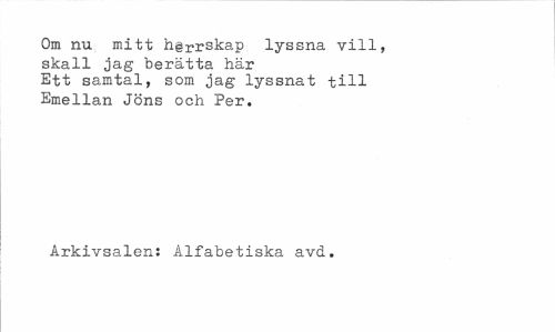 //// Om nu mitt h@rrskap lyssna vill, skall jag berätta här Ett samtal, som jag lyssnat till Emellan Jöns och Per. //// Arkivsalen: Alfabetiska avd. ////