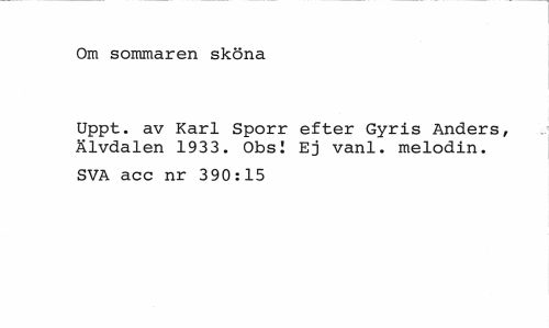 //// Om sommaren sköna //// Uppt. av Karl Sporr efter Gyris Anders, Älvdalen 1933. Obs! Ej vanl. melodin. //// SVA acc nr 390:15 ////