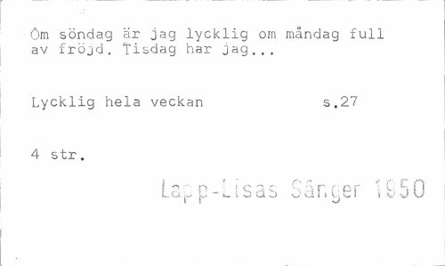 //// öm söndag är jag lycklig om måndag full av fröjd. Tisdag har jag... //// Lycklig hela veckan s.27 //// 4 str, //// Lcr p-Lisas S in er \ 50 ////