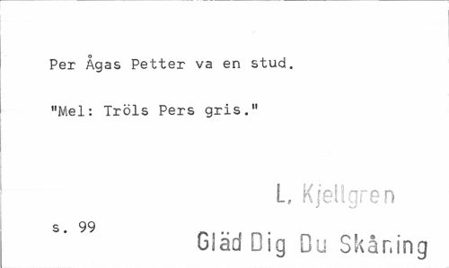//// Per Ågas Petter va en stud. »Mel: Tröls Pers gris." //// 1 L Kjellqren //// J w //// s' " Gläd Dig Du Skåning ////